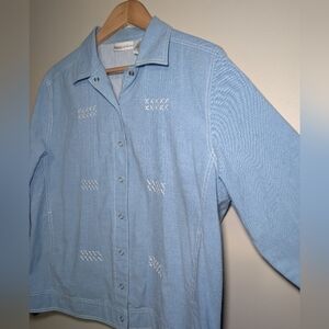 Stylish light blue denim shirt. Features button-up front. Subtle embroidered details add charm.