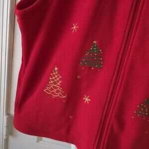 Festive Draper’s & Damon’s women’s petite XL Christmas vest in bright red fleece. Features metallic embroidered and sequin holiday tree designs with gold star accents for a cheerful seasonal look. Zip front closure with stand collar. Cozy, comfortable, and easy to layer over tops for parties, gatherings, or casual holiday wear.