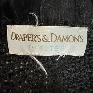 Ships out within 1 business day of purchase. This elegant black cardigan from Draper’s & Damon’s Petites features sheer ruffle trim along the collar and front opening, a lightweight open-knit body, and three-quarter sleeves for a flattering silhouette. The knit fabric offers a breathable, layered look that transitions easily from day to evening. Ideal for dressy occasions or polished casual wear, it pairs beautifully with slacks, skirts, or jeans. Designed for petites, this one is perfect for someone seeking feminine detailing in a compact fit. Keywords: Draper’s & Damon’s, Petites, black cardigan, ruffle trim, knit sweater, shrug, 3/4 sleeve, evening wear, layering piece, dressy cardigan, open knit, petite sweater
