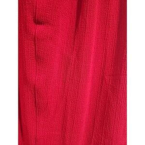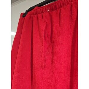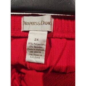 The Draper's & Damon's Red Casual Pants are a stylish and comfortable choice for women in size 2X. Made from a blend of polyester and spandex, these pull-on pants feature a pleated front and a relaxed fit, making them perfect for casual occasions. The high-rise waist and elastic waistband provide added comfort and support, while the straight leg style and solid red color offer a classic and versatile look. With easy care instructions of machine washable, these pants also include convenient pockets and stretch material for added convenience. Perfect for a plus-size woman looking for a chic and practical wardrobe staple.