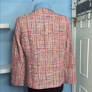 Italy, France, wherever chic style is de rigueur, this tweed jacket shines brighter than them all with traces of gold shimmer threading and sparkly crystals at the collar, placket, and buttons. How brilliant! And how sensational you'll look when you pair it with pleated skirts or dressed-up denim for a look of picture-perfect sophistication. A button front, long sleeves, front pockets, and smooth lining complete its everyday-elegant allure. Hits at hip. Imported.