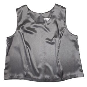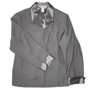 Beautiful, easy 3 piece ensemble in matte and shiny silver is special occasion ready with a long sleeved open jacket, matching lustrous silver tank and pull-on pant. New with tags.