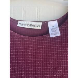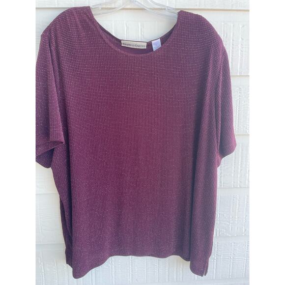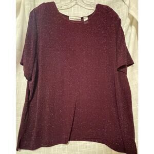 Very sparkly ladies blouse in 3X by Drapers & Damon's. Soft and stretchy in a deep wine color with short sleeves, side slits at the hips. Does have shoulder pads.