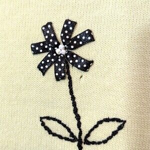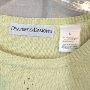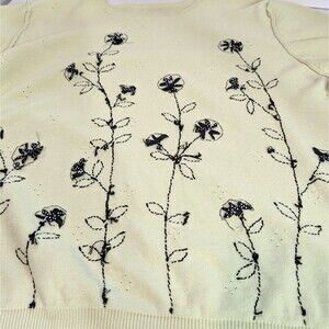 This Women's Draper's & Damon's sweater in size Large features a tight-knit design with a round neckline and short sleeves. The sweater showcases a light green and black floral pattern, making it a versatile piece suitable for various occasions such as travel, everyday wear, casual outings, work, or business meetings. Made from a blend of ramie and cotton knit fabric, the sweater is adorned with beaded and embroidered accents, adding a touch of artistry to the garment. Perfect for all seasons, this pullover sweater is a stylish and comfortable addition to any woman's wardrobe.