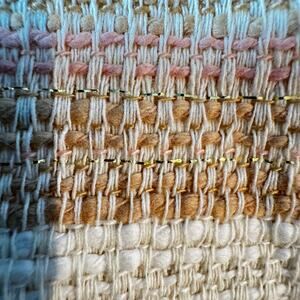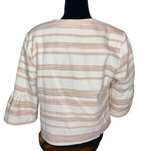 2 - Cream Jacket with Pink & Tank Stripes and Gold Threading - 90% Cotton, 9% polyester, 1% metallic (lining is 100% polyester). Dry clean. Open Front, Bell Sleeve, Lined