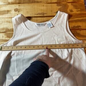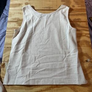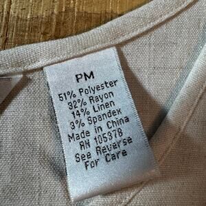 1 - Cream Solid Tank - 51% polyester, 32% Rayon, 14% Linen, 3% spandex. Machine washable