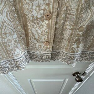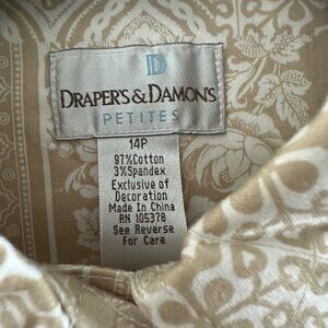 This Draper's & Damon's jacket offers a refined look with its intricate floral pattern in neutral tones. Tailored for petite frames, it features a button-up front and 3/4 sleeves, making it a versatile piece for any wardrobe. The cotton-spandex blend ensures comfort with a slight stretch.