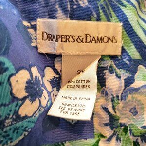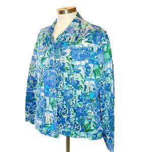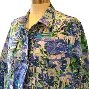 This stylish Drapers and Damons Jacket in woman's plus size 2X, features a vibrant periwinkle blue with green and white. Floral pattern with sailboats in a button front style.