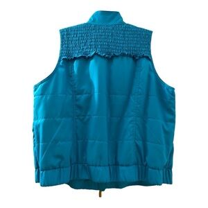 Pretty vest, very feminine. The smocking in on the yoke and across the upper back. Ruffled down the zipper closure. Two vertical pockets. Wonderful condition!