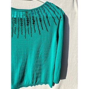 Petite women's green sequin sweater with a round neck and 3/4 sleeves. Boxy Perfect for holiday events. Has a slight flaw on the right sleeve. Made from rayon and nylon. Manufactured in China.