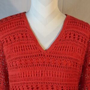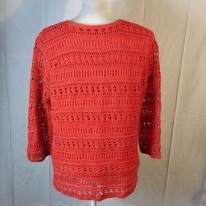 This coral colored 3/4 sleeve Crocheted top is a size. Large petite with a pit to pit measuring 22" and a length of 25". The top is lined at the body with sheer sleeves. In excellent preloved condition. All offers are welcome.