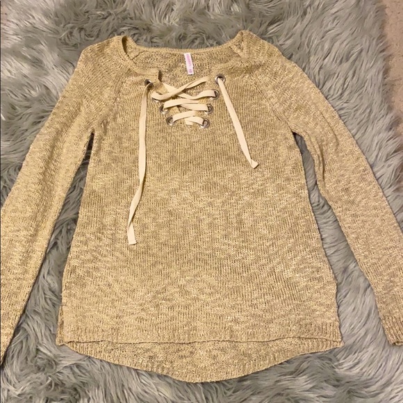 Super cute tan knit sweater size medium. The drawstring detail is cute and looks great off the shoulder with a lace bralette
