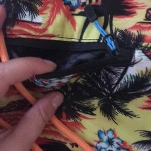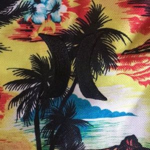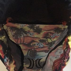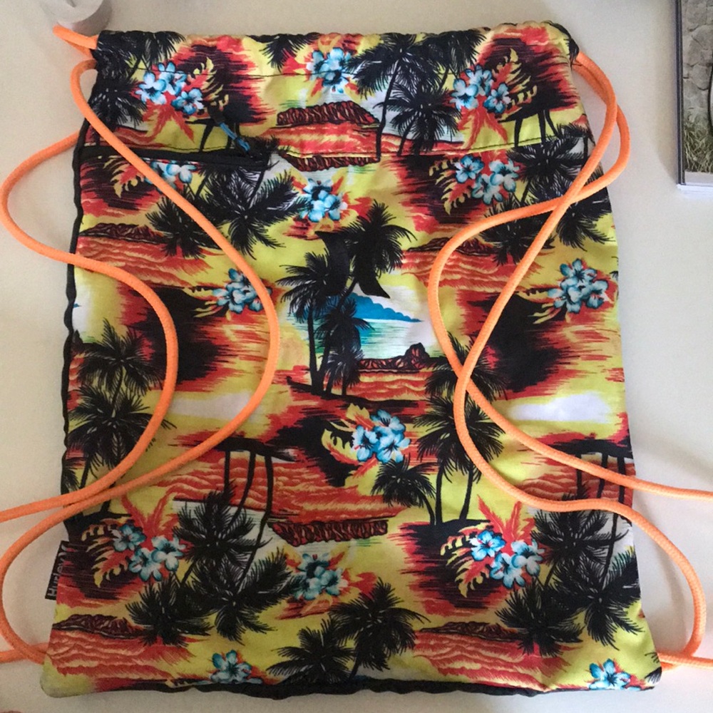 Hurley drawstring backpack with tropical design. Has a small compartment pocket in front and an all black back.