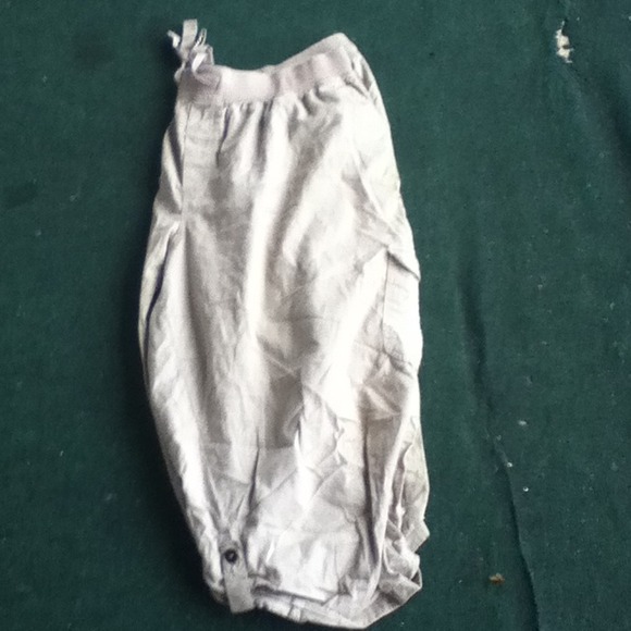 Light tan draw string capris with side pocket and cute detailing on pocket with bottom of legs button detailing. Worn 4 times, no defects. :)