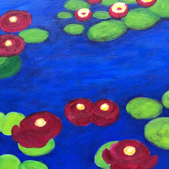 Lily pond drawing. Nice color for a child too. Background is dark blue. Red green little lily