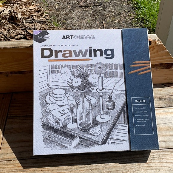 Slightly used drawing kit with instruction book and sketch pad. Missing 2 pencils, sharpener, eraser, and felt pen. Paint and paint brushes never used.