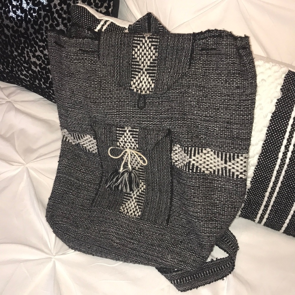 Gently used, drawstring black and white backpack. Front pocket with zipper and decorative tassel. Roomy interior. Some staining on the tassel. Otherwise gives a nice bohemian vibe!
