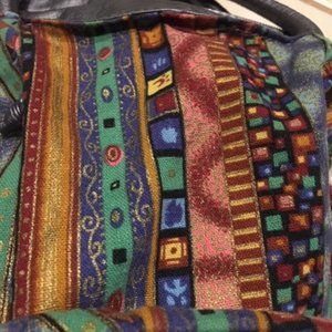 Bag itself is a cloth multi-colored fabric with a zippered closure