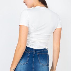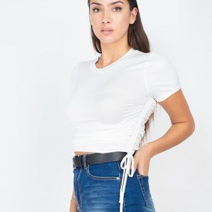 A solid knit top featuring ruched sides with self-tie drawstring, round neckline, short sleeves, fitted silhouette, and a cropped hem.