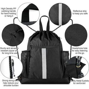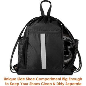🧿CONVENIENT COMPARTMENTS: The big shoe compartment on the right side of gym drawstring backpack can hold two pairs of shoes. The front zipper pocket is roomy to fit a kindle, iPad, sunglasses, and other small items. The inside pocket can hold small valuables such as wallet, cellphone, keys to avoid any pickpockets. And two mesh pockets can carry water bottles, umbrella, sunscreen. Etc.This black drawstring backpack also can be used to store small items.
