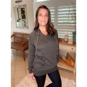 Comfy heather drawstring hoodie with banded bottom. Kangaroo pockets and tunic length. Super soft.