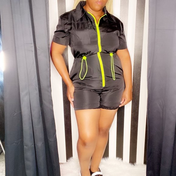 Feature: Pointed collar, Front contrast neon zip up closure, Adjustable waist drawstring, 2 Side pockets, Cuffed short sleeves, Chest flap pocket