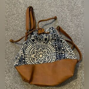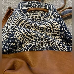 Drawstring purse in blue, cream, and brown. Approximately 11x11.