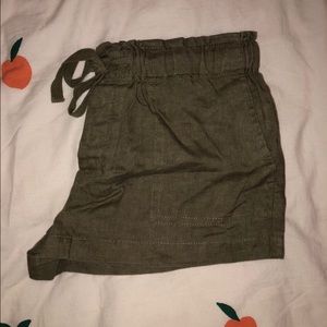 Super cute paper bag shorts! olive green with drawstring waist so very adjustable and has two front buttons! only worn once before they stopped fitting- mid-rise