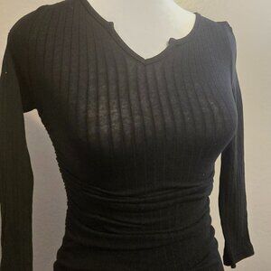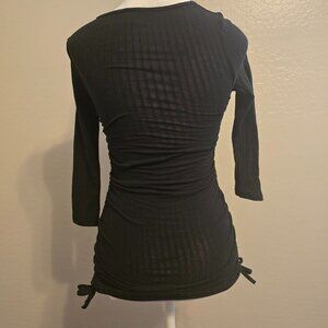 XXS Size 00 Runs very small Has stretch, form fitting, mini with adjustable side drawstring, quarter sleeves