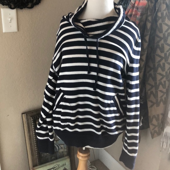 Drawstring neck with pockets warm blue and white striped sweatshirt