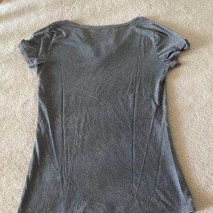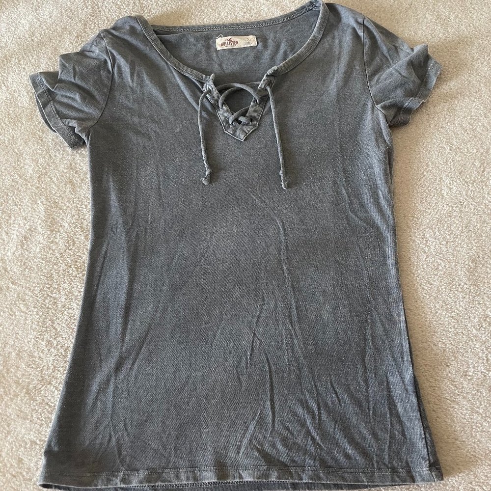 This is a grey shirt with a drawstring pattern at the neckline.