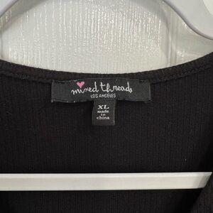Black ribbed crop top with a flattering V-neck and adjustable drawstring ruching at the hem. Short sleeves and soft stretch fabric for comfortable, everyday wear. Versatile piece that pairs easily with high-waist jeans or skirts.