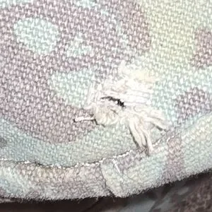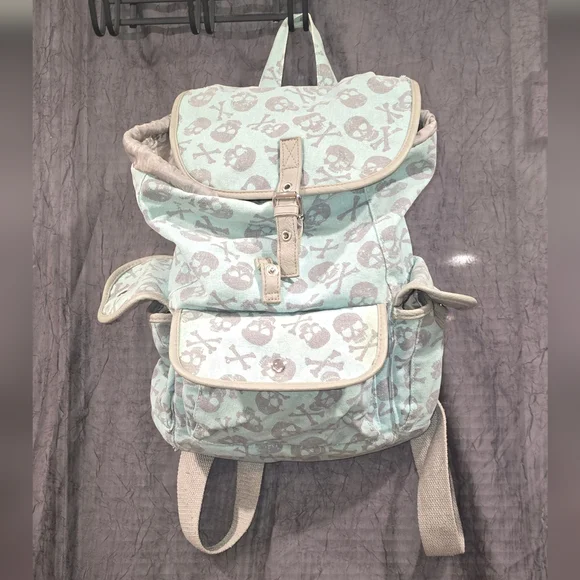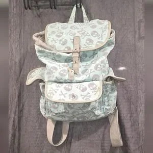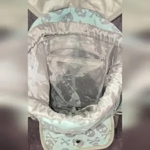 14" tall x 14" wide drawstring backpack with snap closure. inside zip pocket, 3 outside snap pockets, one side pocket is missing snap as seen in picture. small rip on bottom.
