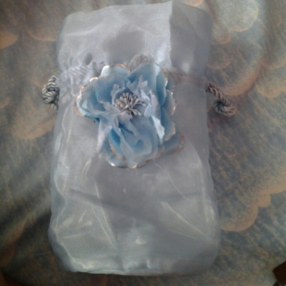Small blue drawstring bag, flower pin on the front. There is a slight bleach stain on the bottom of bag