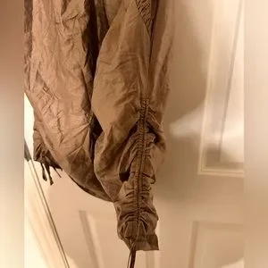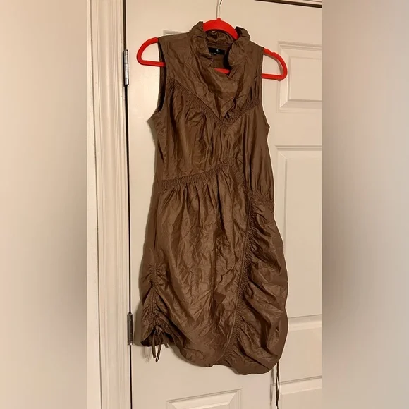 Asymmetrical dress because of the drawstring can be styled many ways. Drawstring helps dress change shape. I consider the dress a pewter color