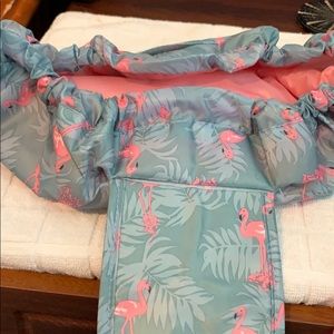 This is something I ordered online and thought I would use and haven’t it is brand new no makeup stains or anything. Makeup is not included it was only used for demonstration. It also has a side pocket inside. Great for traveling or staying overnight. After I took makeup out it folded real nicely by the last picture.