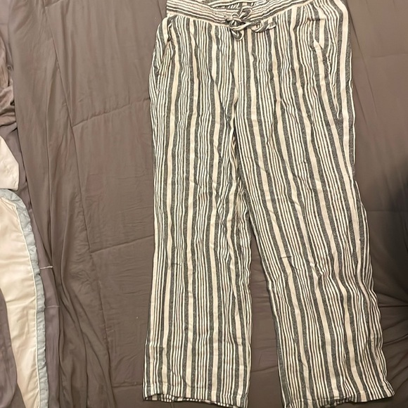 55% linen 45% rayon drawstring pants. Pockets in the front and back. From waist to bottom 37 1/2 inches. Lightly worn. Any questions ask!