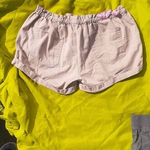 *1 pair Tan drawstring at waist khaki color shorts, crunched look at waist with pink and white plaid lining.