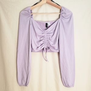 Cropped top in crinkled jersey. Sweetheart neckline at front with drawstring for a draped effect and smocking at back. Long puff sleeves with elastic over shoulders and at cuffs. Polyester content is partly recycled.
