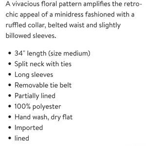 Ciebon floral print mini dress, featuring a vibrant multi color floral print, tie mock neck, long sleeve, lined, glossy silk look polyester, elastic hem sleeve and collar for a comfortable fit, no tie belt, but will include a black patent look belt or add your own. Item is new with tags, high quality designer and not lightweight. View all photos as they are apart of description except no belt. Relaxed fit.