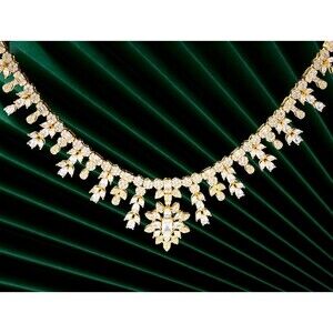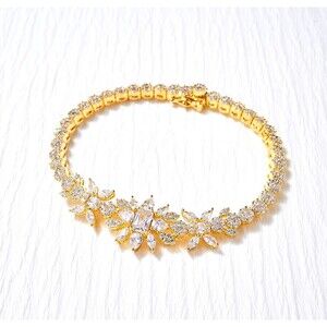 - **A Radiant 4-Piece Necklace Set**: This luxurious gold-plated set features a coordinating necklace, earrings, bracelet, and ring, all beautifully set with sparkling AAA cubic zirconia to complete your bridal jewelry look.