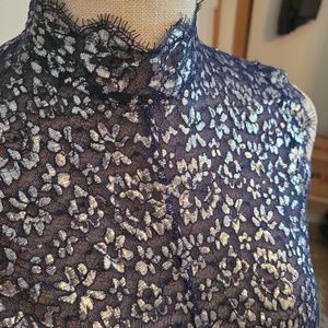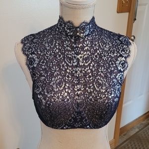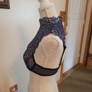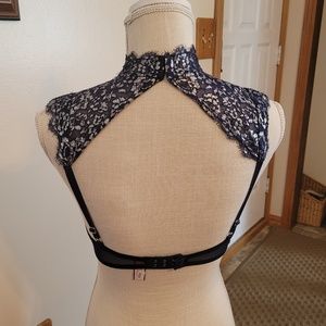 Brand new. This has underwire like regular bra. Is Unlined but has a high neck. Shimmer lace covering front. Has adjustable straps and 2 hook closure at neck and at back like a bra normally would.