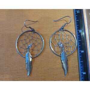 Up for sale is an excellent pair of dream catcher earrings. They appear to be sterling but are not marked. The web is made of metal and there are two clear beads above the feathers. From the bottom of the wire to the tip of the feather is about 2 inches. The width of the web is about 1 1/4. I am guessing my mom got these sometime in the 80's.