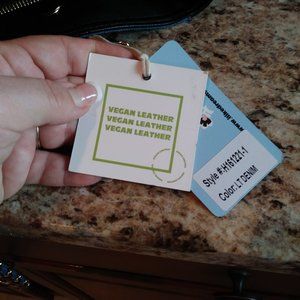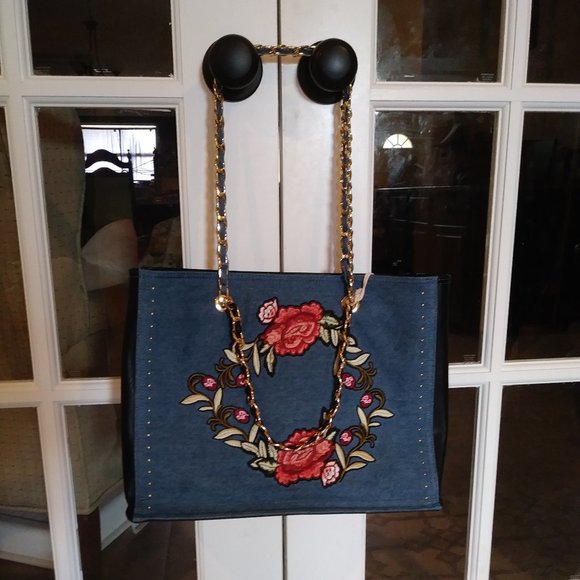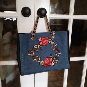 Embroidered roses/leaves on front w/gold metal stud side accents! 2 large open section separated by middle ZIPPERED section, 2 small open pockets, & 1 zip pocket. NO TOP closure! Faux black leather and blue denim are main materials. TWO sets of straps, both w/gold chain - LONGER shoulder straps twined w/denim (drop = 10.5") & hand straps twined w/faux leather (drop = 5.5"). Gold metal feet on bottom. Small stain front bottom right, not noticeable. Not gonna lie, this is HEAVY due to chains! #436