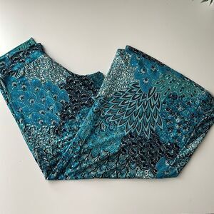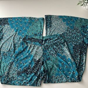Dream Dance peacock print flare pants. Size small. Sequin bling dotted throughout. Soft and shimmery fabric.