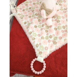 This baby security blanket combines softness and functionality, featuring a plush toy for snuggles and teething rings for soothing gums. Adorned in a delicate pink floral pattern, it offers comfort and practicality in one charming package, perfect to accompany little ones during nap time or play.