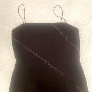 This dress features boning in back, satin cording for straps, satin ribbon crisscross detailing across from, satin covered beads and a hidden zipper in back, and an asymmetrical hemline. Completely lined and in pristine condition. True black. 15” waist; 17.5” waist; 35” from top of strap to shortest side of hem; and 8” difference in hem height.