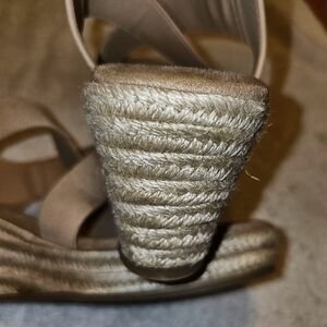 Elegant beige wedges with a comfortable design. Perfect for casual outings.Nearly new Dream Pairs Wedge Sandals. Sz 10. Never worn outside. 3" heel. Stretch straps. Cloth, faux suede upper. Dressy or casual. Neutral color to match anything you want to wear.