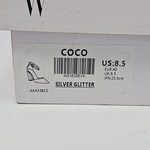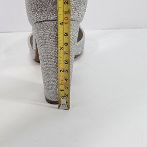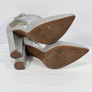 Shimmering block heel pumps featuring a pointed toe, supportive ankle strap with adjustable buckle, and chunky heels measuring approximately 4 inches. Luxe silver glitter finish adds glamour to formal, party, or evening outfits and transitions effortlessly from wedding events to special occasions. The comfortable cushioned insole and sturdy heel design offer reliable support for hours of wear. Women's size US 8.5 (EUR 40, UK 6.5, JPN 25.5cm). Good pre-owned condition with moderate wear on soles, no major flaws to upper material. Style code AAA53BCE. Item includes original box.