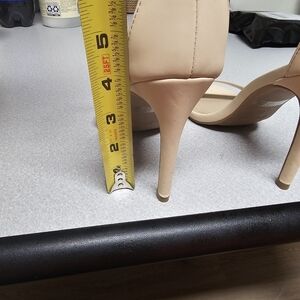 These cream heels from Dream Pairs feature a thin ankle strap with a small buckle closure and a single wide strap across the front. The round-shaped toe area and 4" heel provide a modern and sleek look, making them suitable for dressier occasions.